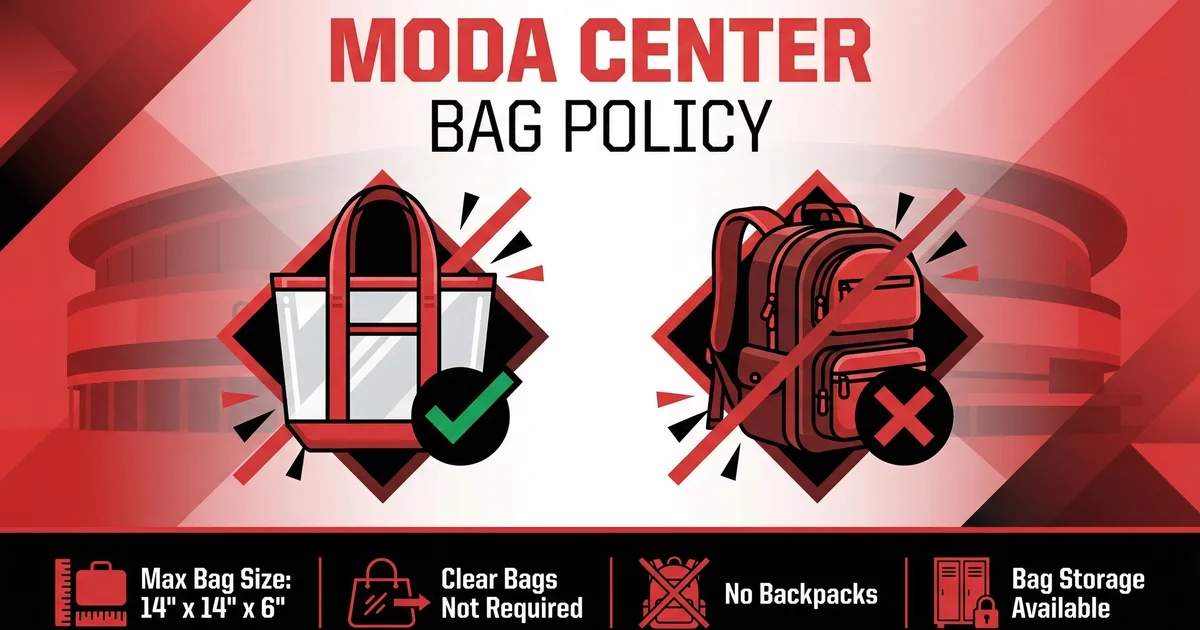 The Moda Center in Portland, Oregon enforces a strict bag size policy limiting all bags to 14″ x 14″ x 6″ or smaller, with backpacks completely prohibited regardless of size. This policy applies to all events at the venue, including Portland Trail Blazers games, concerts, and other entertainment experiences.