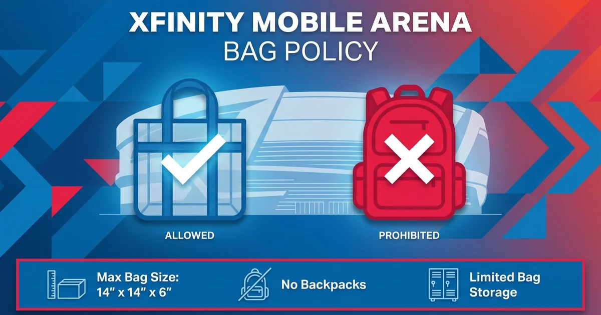 The Xfinity Mobile Arena concert bag policy permits hand clutches, wristlets, and small purses up to 4.5″ x 6.5″ without X-ray screening. Larger bags up to 14″ x 14″ x 6″ require X-ray checks at specific entrances, while backpacks and large multi-compartment bags are prohibited.